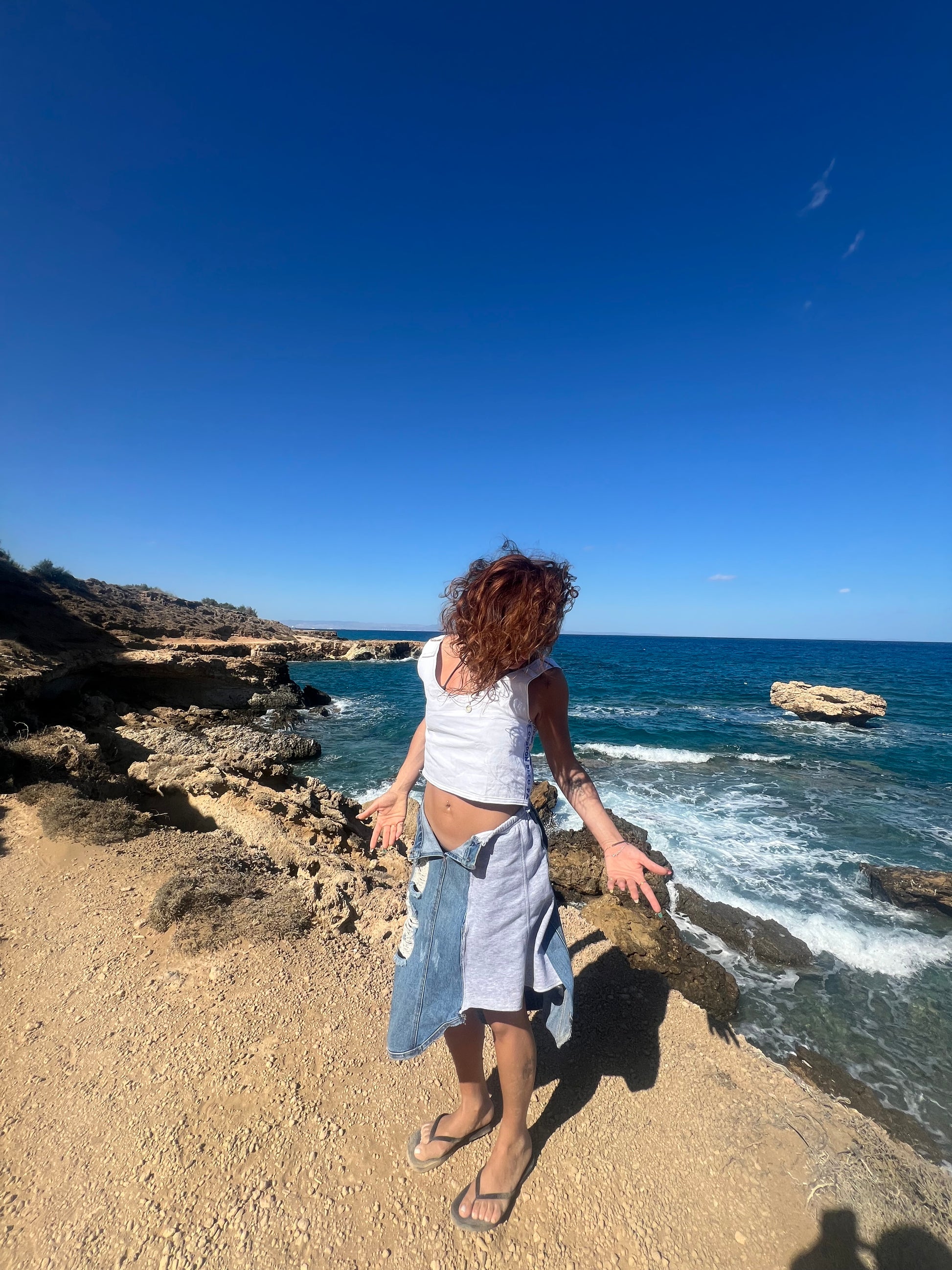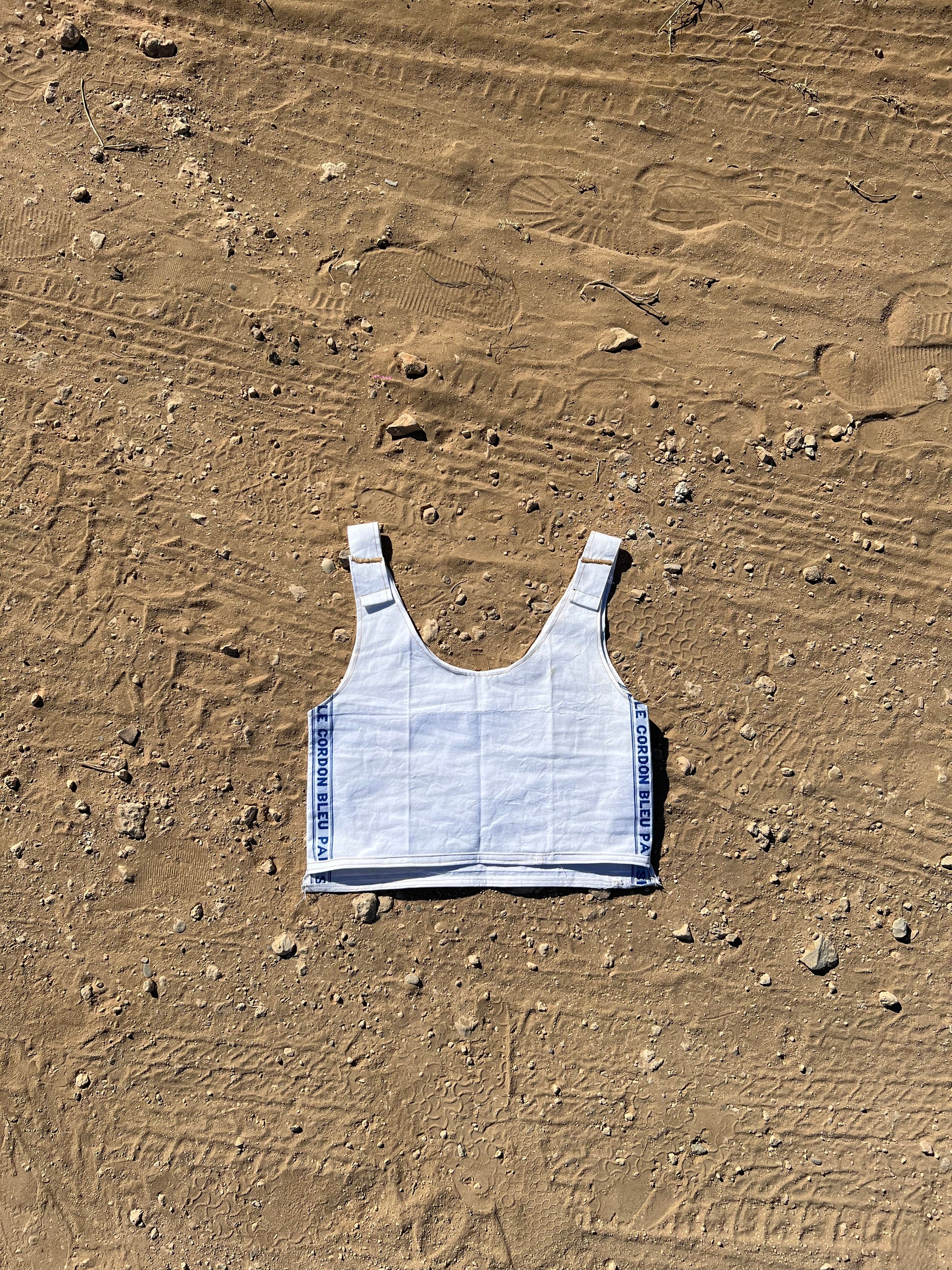 these woven cotton tea towels were given to my mum from her dearest friend who worked at 'Le Cordon Bleu Paris' which is a French hospitality and culinary education institution, teaching haute cuisine. I thought it would be quite cool to make a vest with a panel over the shoulders obviously dysfunctional but purposely to look as if you're able to tighten. it's rough on the seams matching well with the 'skin skirt' as a whole. This is naturally hand covered in sand when I was away and using the nature for me was the most purest way to sand wash/stain.